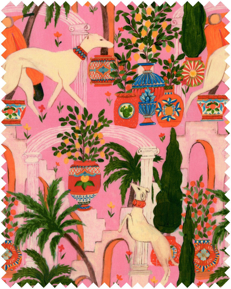 In the heart of an Italian palace, where the whispers of history mingle with the scent of blooming flowers, lies LA DOLCE VITA. At the center of this heavyweight velvet fabric stand two regal dogs, their graceful forms and noble demeanor serving as a testament to the grandeur of Italian aristocracy. Adorned with gilded collars and jeweled accessories, they exude an air of aristocratic charm, as if they were the guardians of a bygone era. Majestic palm trees sway gently in the breeze, their fronds casting dappled shadows across the scene and adding a sense of tropical allure. Transform your own space into a sophisticated Italian palace by adorning your window with DOLCE VITA curtains or upholster your much loved pieces of furniture.