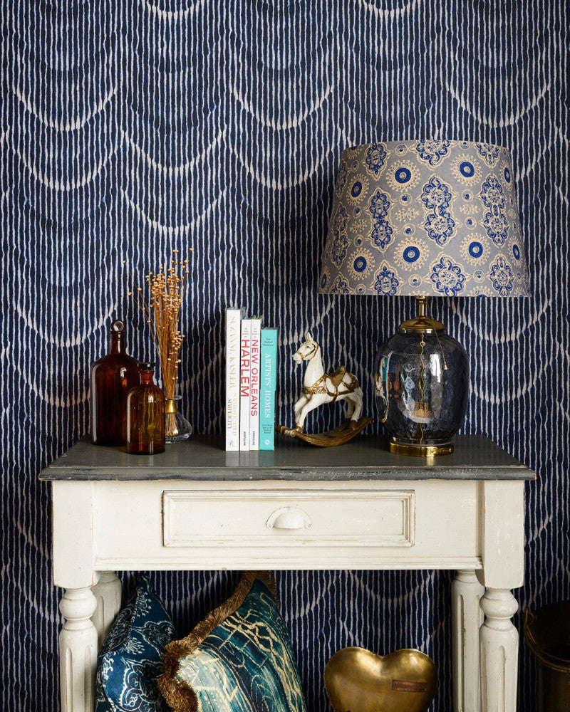 This two-toned wallpaper features a hand made design in white against a strong indigo toned background. Illusionary waves are created by mixing the two tones in a design process similar to hand dying fabrics.