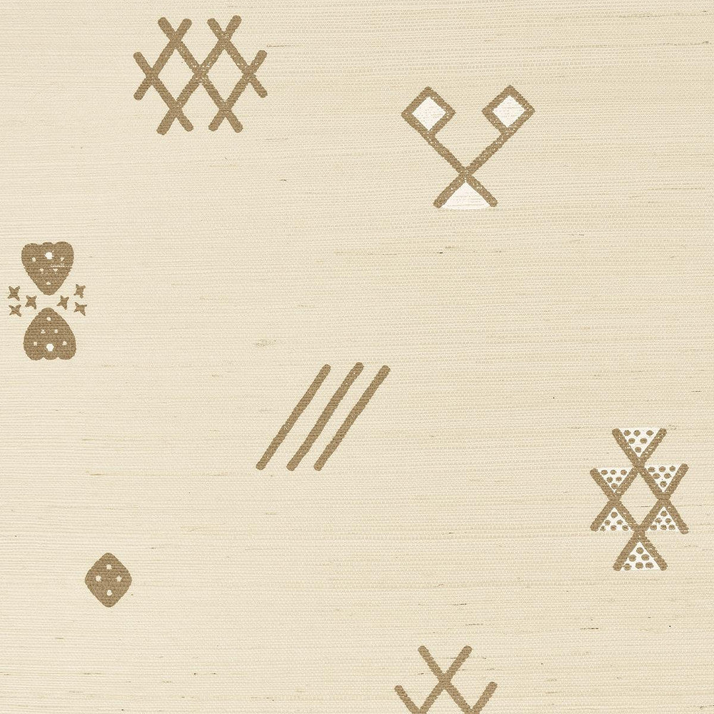 Samsun Sisal wallpaper in natural features a full-width layout of mystical free-floating, hand-printed motifs. Also available as an embroidered casement.